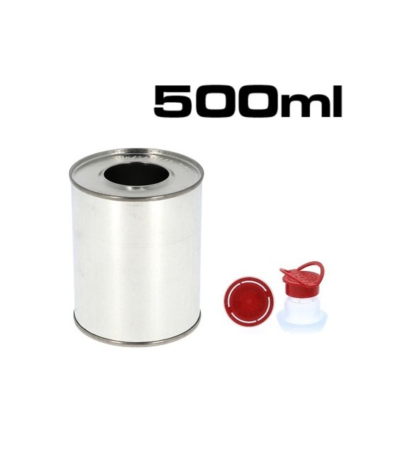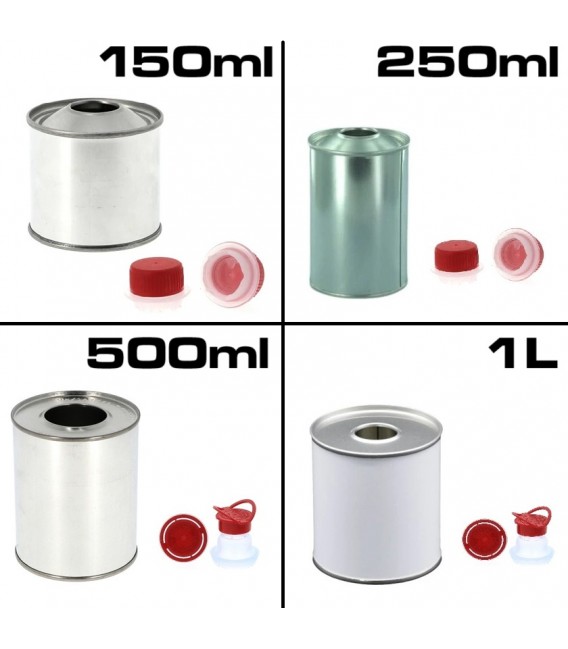 Latas metálicas de 500 ml e 1 litro com tampas de rosca.
